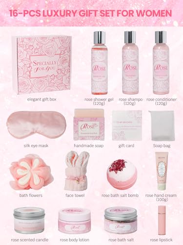 16Pcs Rose Spa Kit – Relaxing Bath & Body Care Gift Set with Bath Bombs & Lotions for Women. The Perfect Mother’s Day Birthday Christmas or Thank You Gift for Mom Wife Friend Relaxing Home Spa Set
